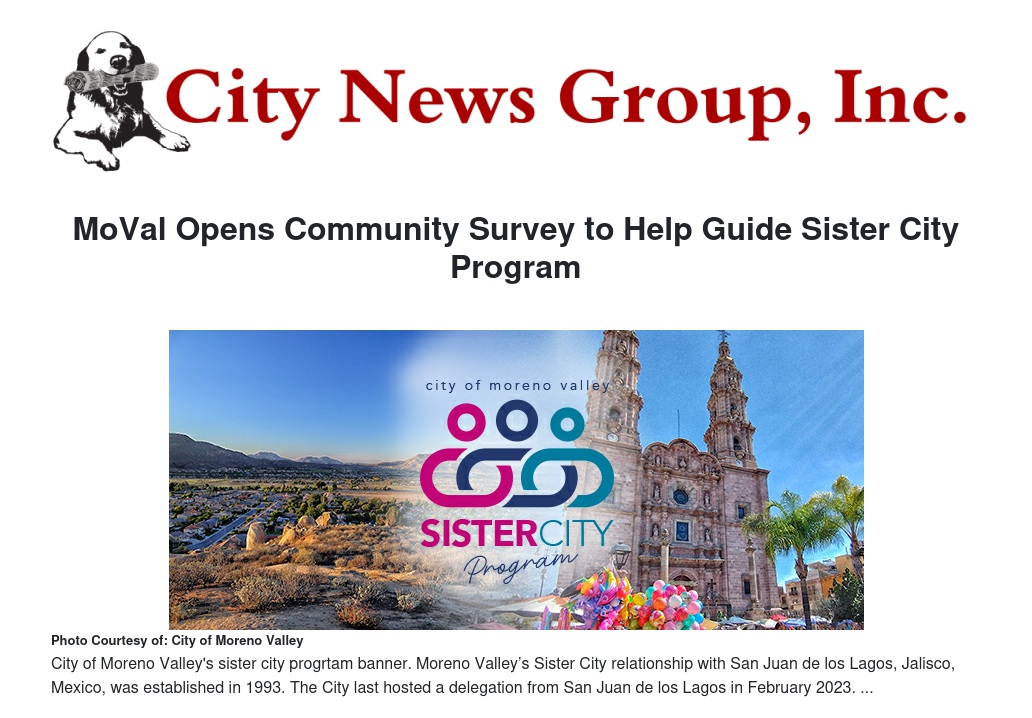 The City of Moreno Valley is inviting residents to participate in a community survey to provide feedback on the City’s Sister City Program, which will be open from January 5 through February 5. The City is seeking broad community input as it evaluates the program’s level of activity and potential next steps.