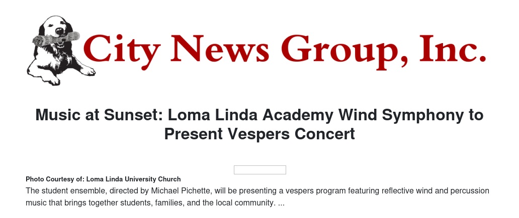 Music at Sunset: Loma Linda Academy Wind Symphony to Present Vespers Concert by Stella Pierce - City News Group, Inc.