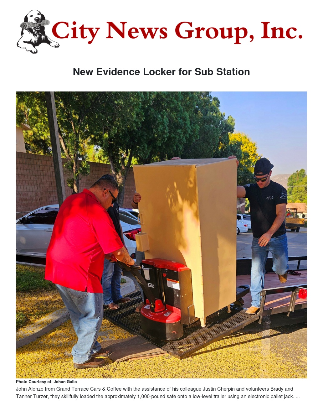 We are thrilled to share an exciting update on the Grand Terrace Substation Project. Recently, Ed Giroux of GT Cars and Coffee connected with the Soso Family in Colton, who generously offered to donate a large custom-made gun safe to the Sheriff's Station.