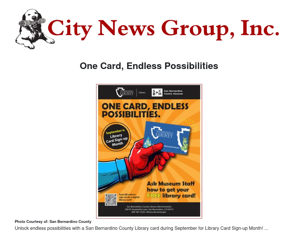 This September, the San Bernardino County Library (SBCL), in collaboration with the San Bernardino County Museum (SBCM), invites you to celebrate Library Card Sign-Up Month to discover how a single card can open the door to endless opportunities.