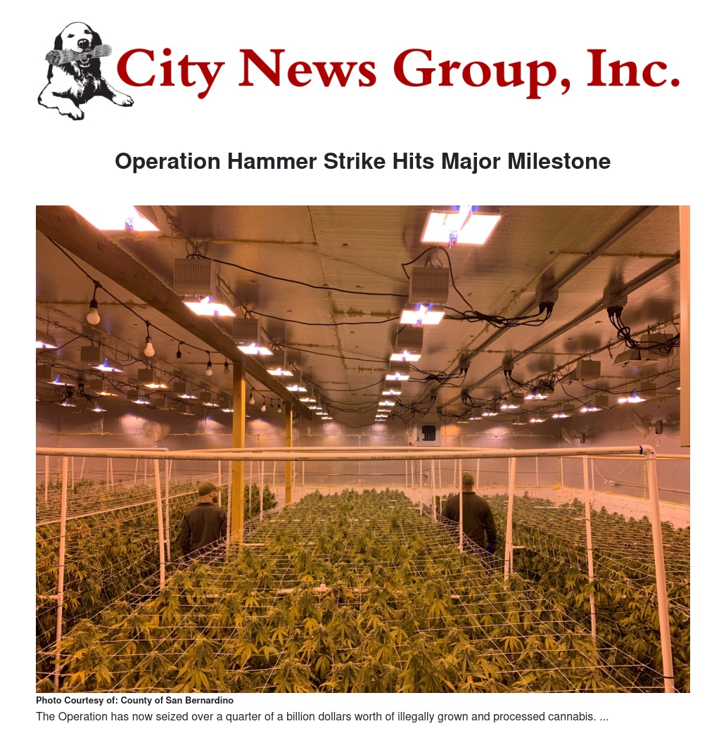 The San Bernardino County Sheriff’s Department reached a notable milestone in Week #15 of Operation Hammer Strike. With this week’s haul, the Operation has now seized over one quarter of a billion dollars worth of illegally grown and processed cannabis. These products were produced at cultivation sites in the County that were not in compliance with California's Medical and Adult-Use Cannabis Regulation and Safety Act and San Bernardino County's ordinance prohibiting Commercial Cannabis Activity.