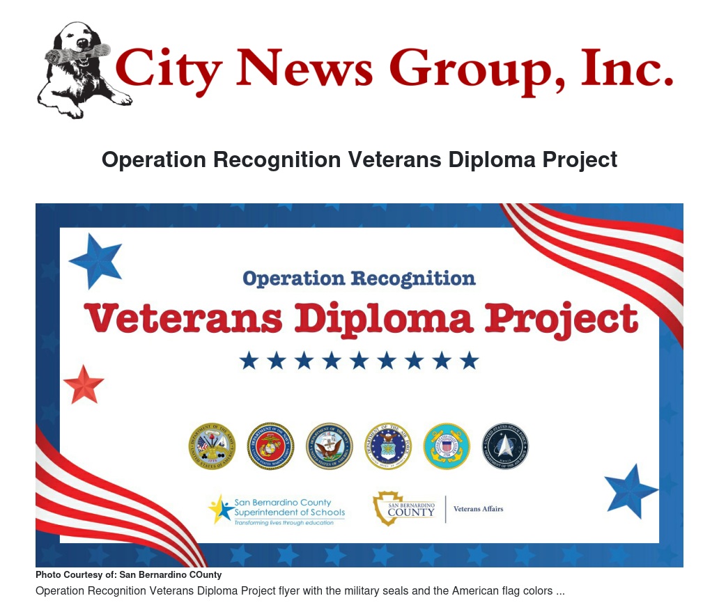 San Bernardino County Superintendent of Schools (SBCSS), in partnership with the San Bernardino County Department of Veterans Affairs, is now accepting applications for the 16th Annual Operation Recognition Veterans Diploma Project.