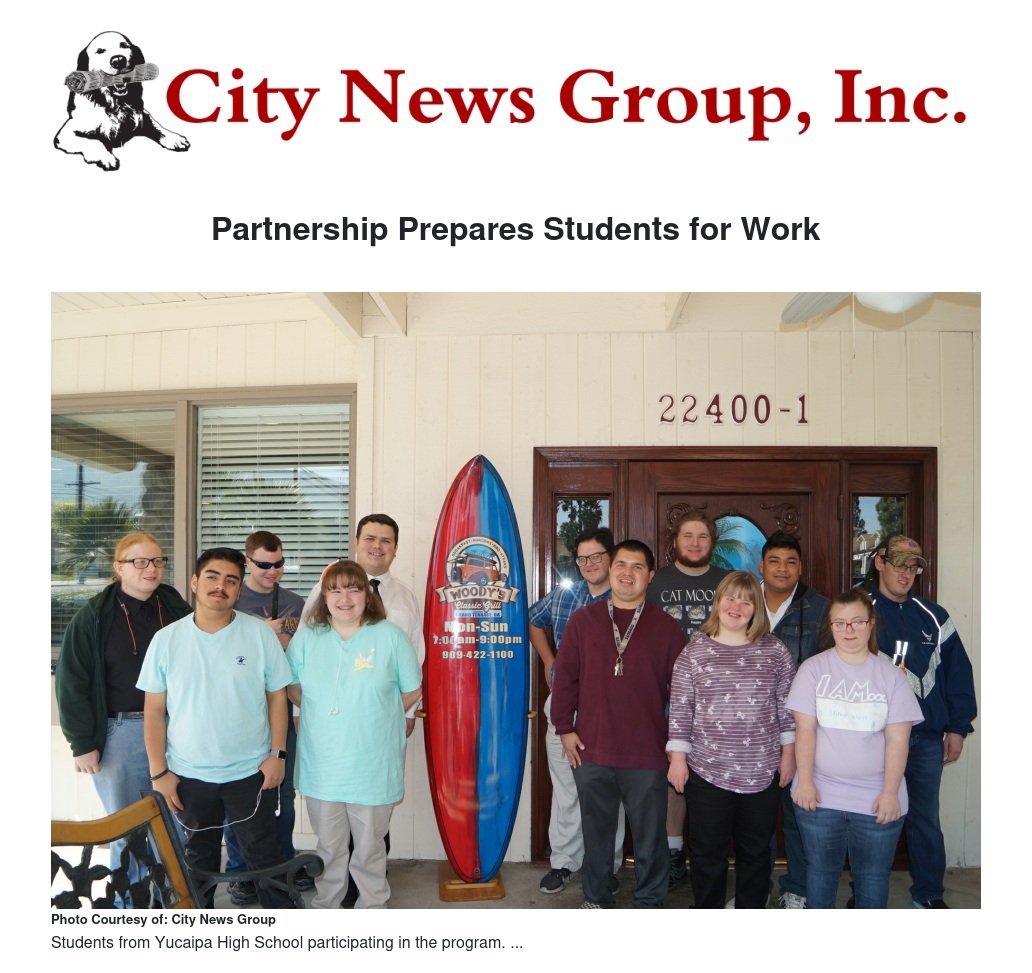 On Monday, February 25, 2019, a group of students enrolled in a Vocational Transition Program at Yucaipa High School visited a restaurant Woody's Classic Grill in Grand Terrace. The Vocational Transition Program is a program for students with developmental disabilities that emphasizes the students’ work and social skills. Teacher Scott Salinas describes the program as getting his students ready for work in the community.