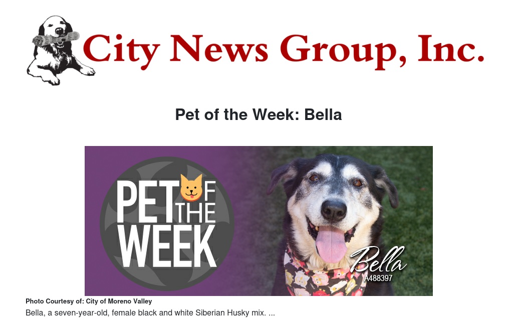If you would like to make Bella, or any pet from the Moreno Valley Animal Shelter, part of your family, please call 951.413.3790 or visit moval.org/pets.
