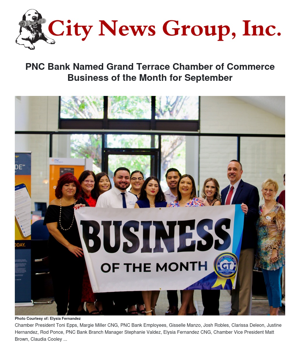 The Grand Terrace Chamber of Commerce is thrilled to announce PNC Bank as the Business of the Month for September! Under the leadership of Branch Manager Stephanie Valdez, PNC Bank has been recognized as one of the top branches in the nation, thanks to its exceptional service and dedication to the local community.
