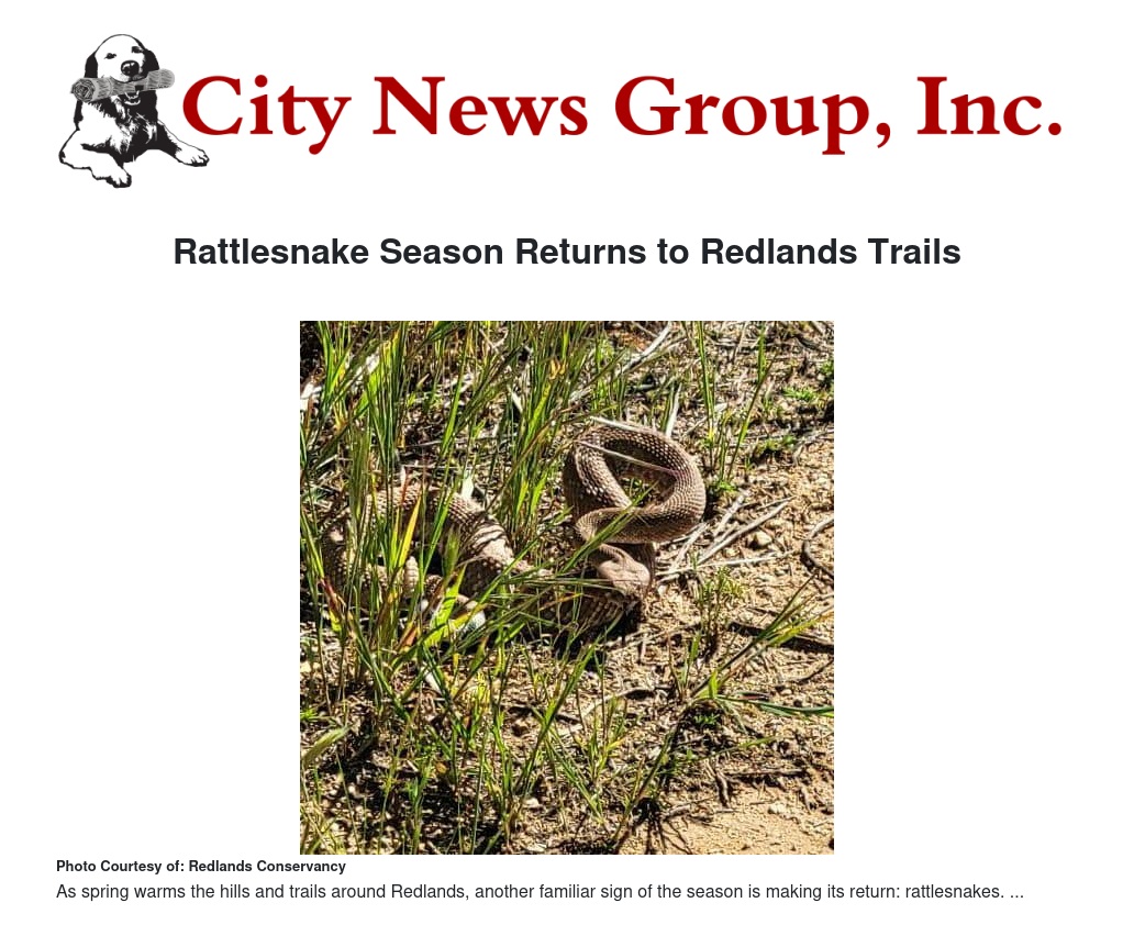 The message is clear: with a little caution and respect for wildlife, residents can continue to safely enjoy Redlands’ scenic trails all season long.