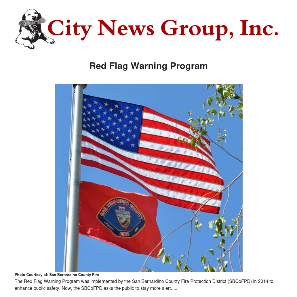 To promote Wildfire Readiness, San Bernardino County Fire Protection District (SBCoFPD) implemented the Red Flag Warning Program in 2014 as the Santa Ana winds and the possibility of wildfires strongly brewed over the area. The Red Flag Warning is designed to enhance public safety by providing a visual reminder that extreme fire conditions are predicted or present.