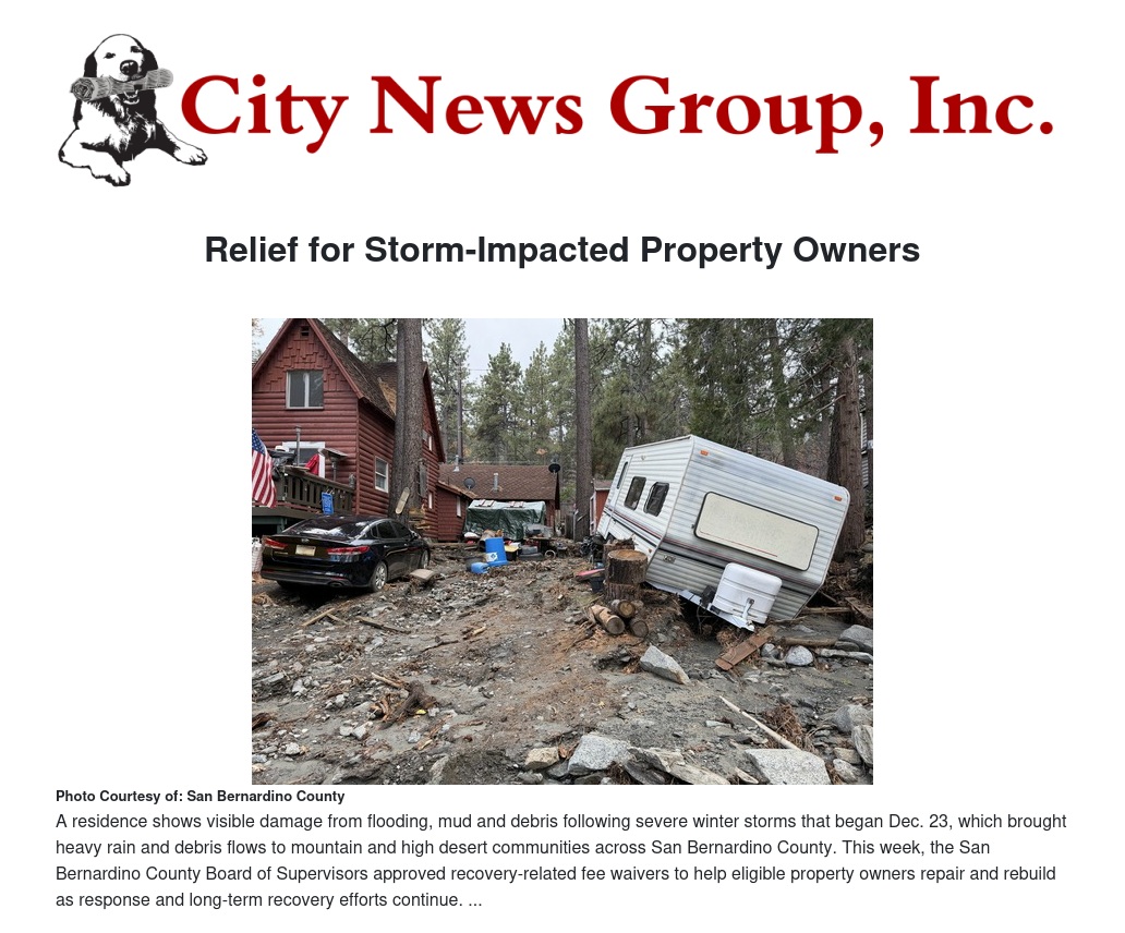 The San Bernardino County Board of Supervisors on Tuesday unanimously approved recovery fee waivers to help eligible property owners repair and rebuild following severe winter storms that started on Dec. 23.