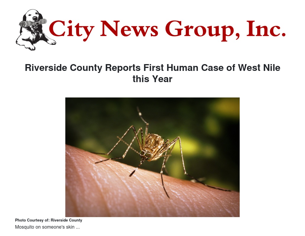 Riverside County Reports First Human Case of West Nile this Year by WIlliam Redman - City News Group, Inc.
