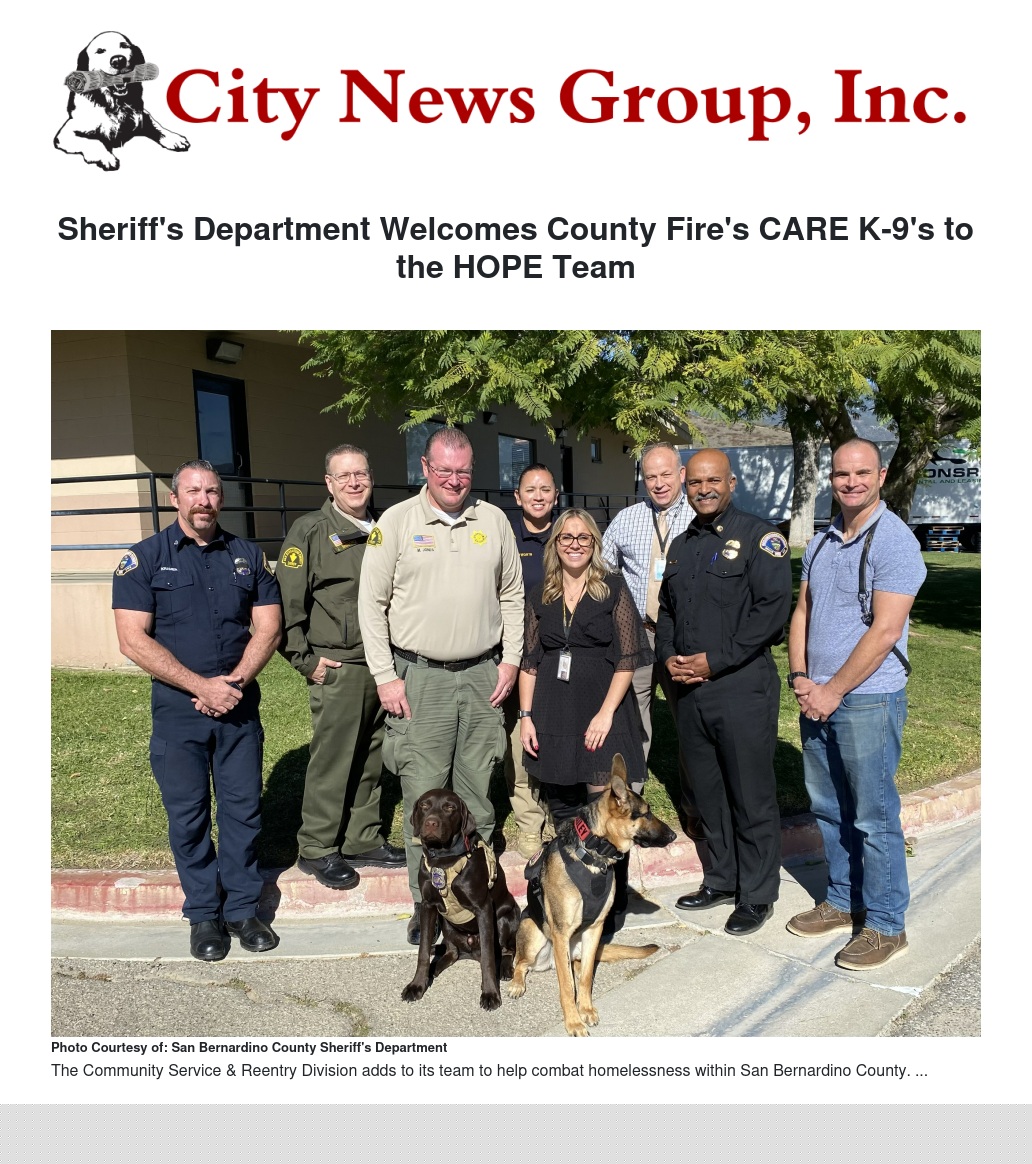 The Community Service & Reentry Division welcomes San Bernardino County Fire District Captain Paul Kramer and Engineer/Paramedic Steven Story, and their CARE K9 partners Bailey and Cooper, to our HOPE Team.
