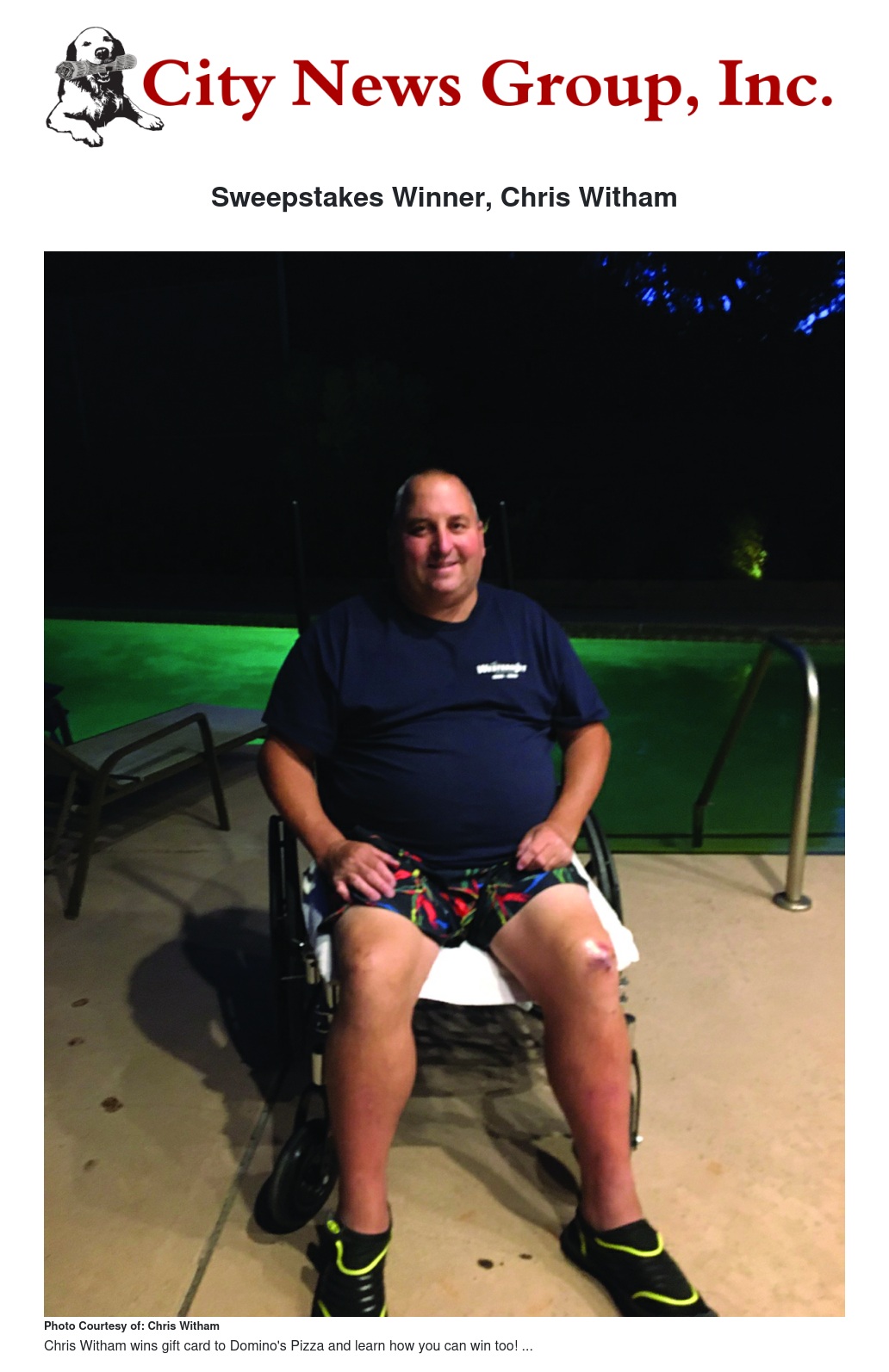 This week’s winner, Chris Witham, resident of Cathedral City, heard about the City News Group Sweepstakes from a friend while they were having lunch at one of the sweepstakes’ participating restaurants, Vicky’s.
