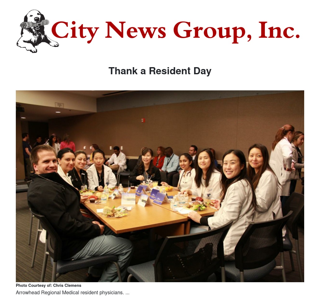 Arrowhead Regional Medical Center (ARMC) recently recognized 182 resident physicians in celebration of “Thank a Resident Day.” ARMC residents are an integral part of the health care delivery team and serve as an indispensable resource for medical students. ARMC leadership, hospital staff, and medical students joined together for lunch on Feb. 21 to honor the dedication and hard work of residents.
