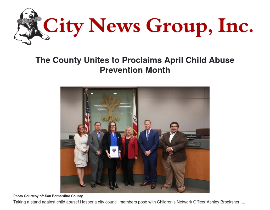 “We remain dedicated to raising awareness during April for Child Abuse Prevention Month, and we appreciate the renewed commitment from cities across San Bernardino County,” said Children’s Network Officer Ashley Brooksher. “Child abuse, including physical, emotional, sexual abuse and neglect, can have lasting effects on individuals and communities. Safe, stable, and nurturing environments are key to preventing abuse and promoting healthy development.”
