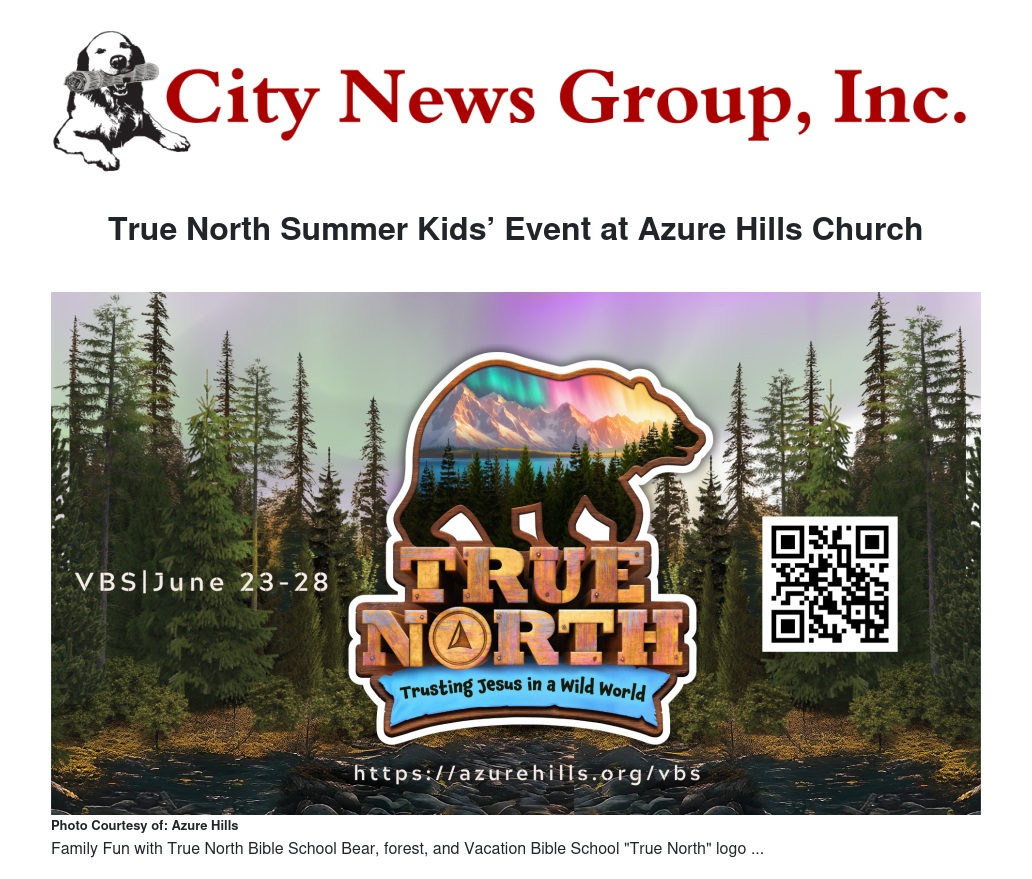 Join us for a free, fun, safe, and creative week at True North, a Vacation Bible School (VBS) for kids ages 2–12. From June 23 to June 27, with a special program on June 28, kids will enjoy music, games, snacks, crafts, and inspiring stories that help build friendship, confidence, and character. In addition, kids will participate in a meaningful effort to help local children in need. The kids' program runs from 6:00–8:30 PM each evening.