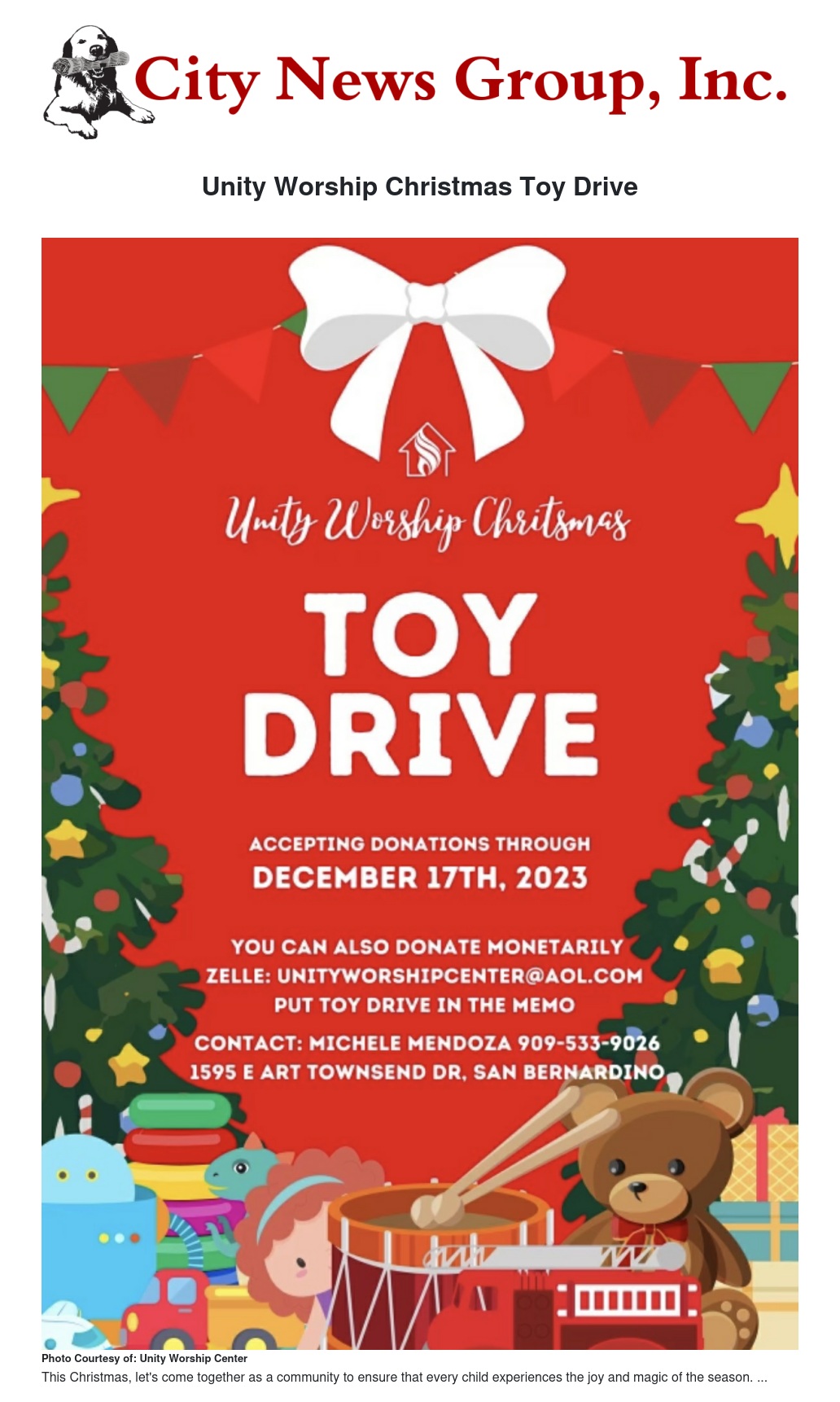 Unity Worship Center is Spreading Joy this Christmas Season by hosting their annual Christmas Toy Drive. As the festive season approaches, our hearts are filled with love, kindness, and a deep desire to make a positive impact in our communities. This Christmas, we at Unity Worship Center are excited to spread the holiday joy and bring smiles to children's faces through our annual Toy Drive. Leader and Pastor, Tim Arroyo has been wholeheartedly committed to ensuring that every child in our community experiences the magic and joy of Christmas regardless of their circumstances. Last year Unity Worship Center was able to serve over 50 unprivileged families, this year we are determined to expand our reach and connect with more families in need. Unity Worship Center is reaching out to our wonderful community to join forces and make a difference in the lives of children. If you are interested in donating and contributing to our Toy Drive or for more information on attending, please contact Michelle Mendoza / Event Coordinator at: (909)533-9026.