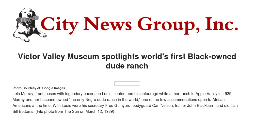 Lela was sick with lung issues, so the couple moved from the city, buying the Apple Valley property for $100. At the height of widespread segregation practices, their ranch became a favorite vacation spot for the Black community. For nearly 20 years, Murray’s Dude Ranch operated with a pool, tennis courts, riding stables and several small houses. Murray’s Dude Ranch was known for filming Black Westerns and entertaining Hollywood guests like Clark Gable, Lena Horne and boxing champ Joe Louis.