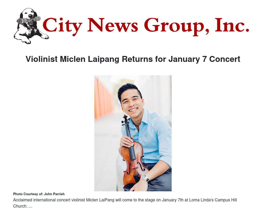 Acclaimed international concert violinist Miclen LaiPang is scheduled to return to Loma Linda from Germany for a concert of sacred and classical music on Saturday, January 7. The evening program will also feature regional keyboard artist Dr. Kimo Smith at the piano.