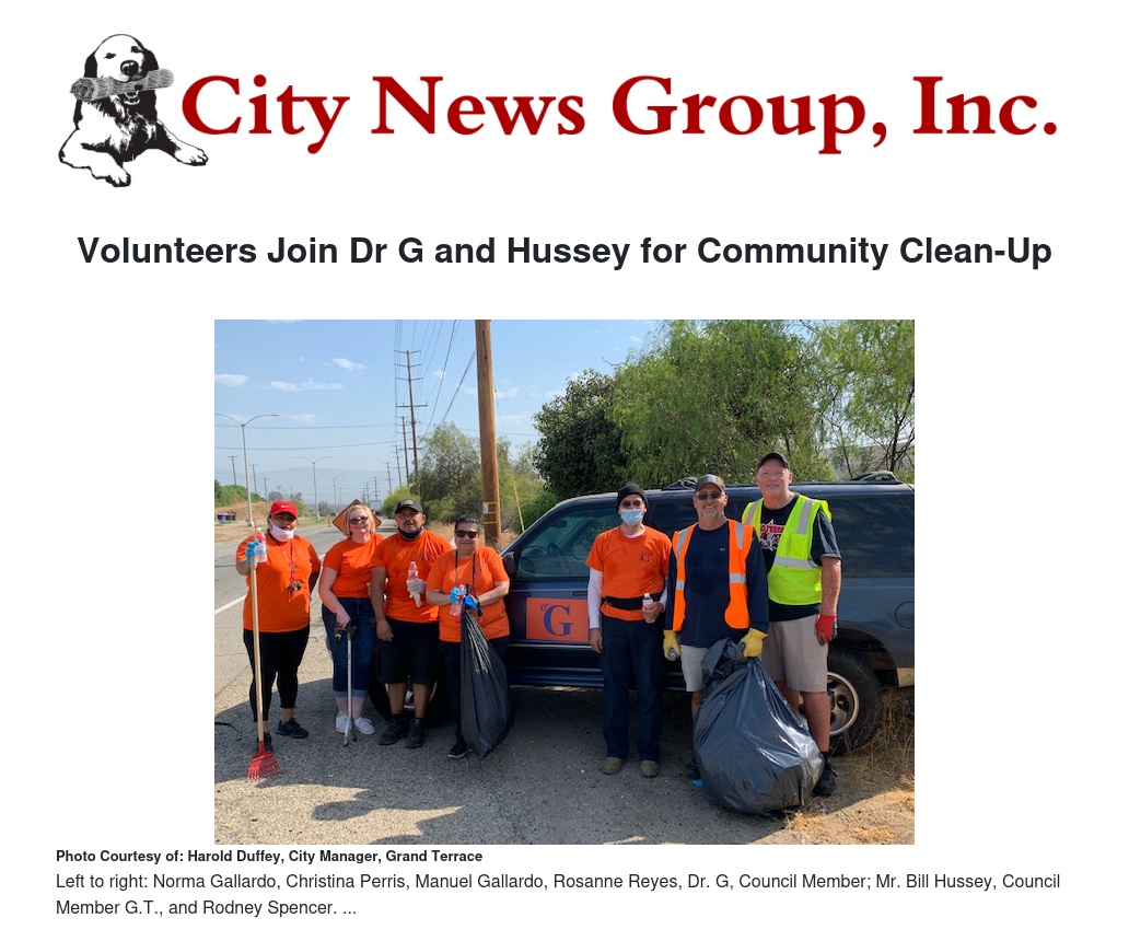 The CITY TALK trash clean-up efforts over the years have continued to evolve, and the most recent project last weekend was an excellent example of resident volunteers stepping up to help make a difference. Dr. G, who is well-known for putting together community projects contacted Council Member Mr. Bill Hussey of Grand Terrace, with the idea of organizing a collaborative clean-up event. Mr. Hussey, quickly responded, “I’ll be there.”