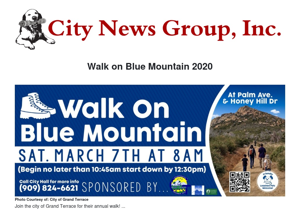 Don't miss out on this year's annual Walk on Blue Mountain. Happening on March 7th at 8am. Palm Avenue and Honey Hill Drive. Leashed pets are allowed but make sure to pick up after them.