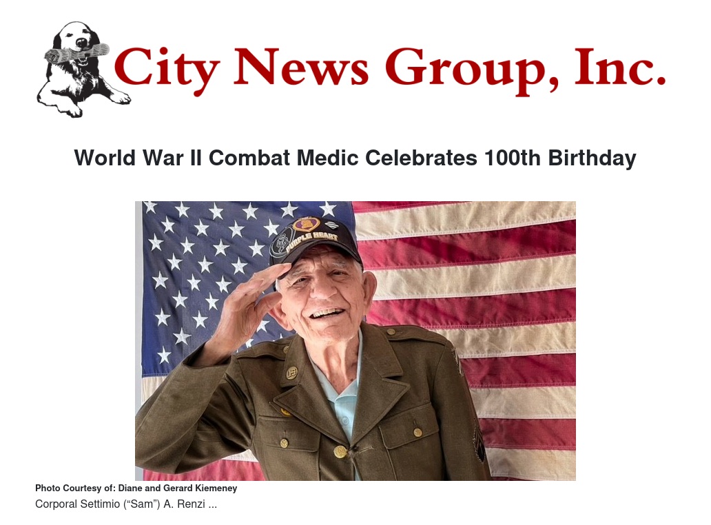 On October, 6, 2023, I’ll be celebrating my 100th birthday. “And I’m still good-looking,” said Corporal Settimio (“Sam”) A. Renzi. Here are my thoughts when I reflect back on some of the most significant events of my life. I went to war without a gun. I was a Combat Medic and as a Seventh-day Adventist Christian, I didn’t believe in taking a life. I was a “conscientious cooperator,” so we trained as medics. (A medic’s life on the front lines averaged two minutes.) I have been in three campaigns (battles) and was in the invasion of Southern France. On November 2, 1944 in the town of St. Die, France, I almost died because I stepped on a landmine rescuing five soldiers who had stepped on mines. I was awarded a Purple Heart medal and a Bronze Star medal for bravery. I should never have been drafted in the army because I was enrolled in college in training as a theological student. One incident, etched in my memory, was when a roadblock was established at Saint Dizer highway where my outfit, Company A, shot and killed a 56-year old German Major General, Max Schmidt. General Schmidt had fought in Russia and had conducted an Artillery School the past Autumn. I was admitted to four army hospitals and was discharged before the war was over. My injury was to my ankle and foot from stepping on a landmine. A piece of shrapnel went up through my right heel and out the ankle. God took care of me. Following my military service, I resumed my theological training and pastored for over 40 years in the Seventh-day Adventist denomination. For several years, I volunteered at Support Our Troops committee at Loma Linda University. I’ve “already” had a good and meaningful life and for that, I am grateful to God! On October 6, 2023, I will be 100 years old. My aim is to outIive Methusaleh in the Bible, who lived to 969 years old. I don’t know when the Lord will call me, but if He does, I’m thinking I won’t answer the phone.
